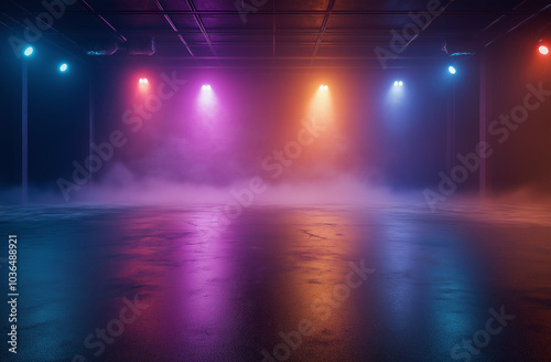 Hyper-Realistic Dark Room with Fog, Neon Lights, Empty Stage, and Concrete Background for a Mysterious Vibe