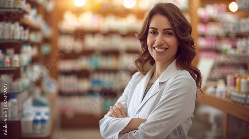 hyper-realistic detailed portrait of a beautiful smiling pharmacist woman working in pharmacy