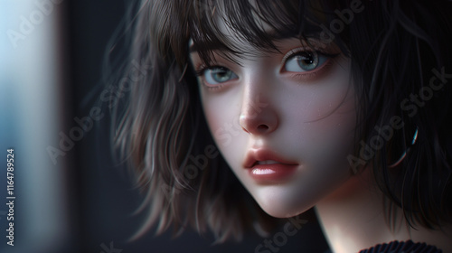 Hyper-Realistic Illustration of a Young Woman with Short Hair and Deep Eyes in Emotional Portrait.