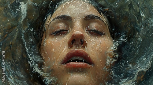 closeup, wet hair, water droplets, human face, eyes closed, water spray, underwater, art, painting, fine art, bod, skin, expression, emotion, beauty