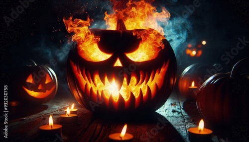 Hyper-realistic photograph of a burning pumpkin with flames engulfing its carved face, set against a dark, eerie background