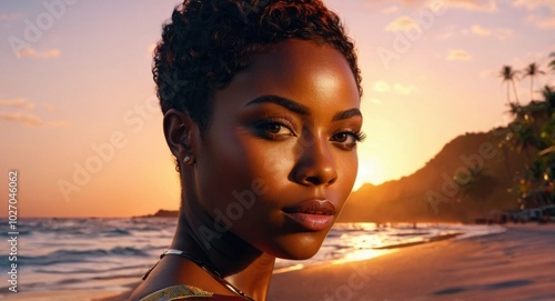 portrait, short hair, dark skin, glowing sunset, radiant, natural beauty, detailed, hi-res, warm tones, photorealistic, depth, graceful, inviting