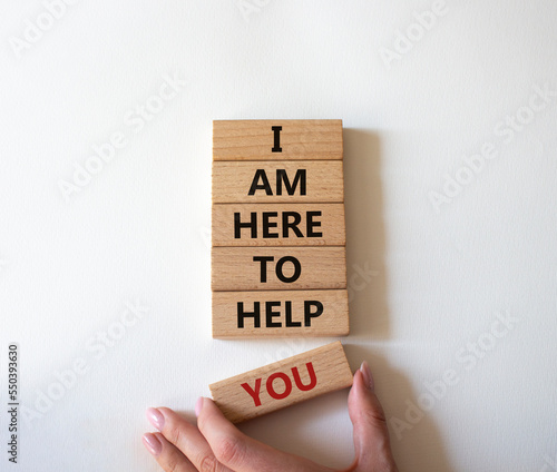 I am here to help symbol. Concept words I am here to help on wooden blocks. Beautiful white background. Businessman hand. Businessman hand. Business and help concept. Copy space.