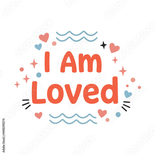 "I Am Loved Positive Quote with Colorful Hearts and Waves – Self Love Motivational Typography Design"