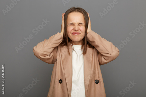 I don't want hear you. Indoor shot of woman with dark hair, with frowning face wearing jacket standing against gray wall, holding hands on ears and closed eyes, very loud sounds.