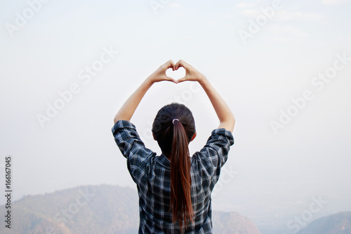 I love travel concept : Freedom traveler woman standing with heart shaped hands and enjoy a wonderful nature