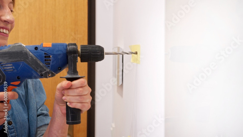 I will hang a picture here, cheerful woman drilling the wall. High quality photo
