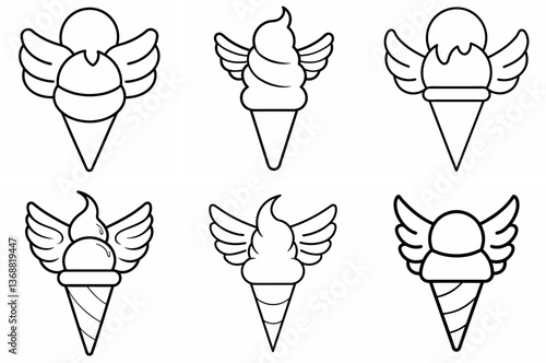 Ice Cream Cone with Wings Outline Coloring Page - Line Art Drawing Set on White Background