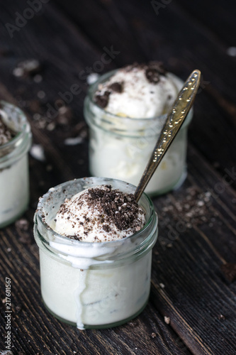 no people, food and drink, ice cream, photo, frozen food, food, color image, glacé, sweet food, closeup, dairy product, melting, dessert, chocolate, indulgence, freshness, gelato, eating, epicure, summer, indoor, still life, cut-out, sphere, spoon, textured, snack, slice, modern, refreshment, metal, brown, milk, cream, rustic, wooden, space, text, cookie, ice