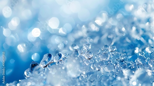 Ice crystals and droplets of water in closeup microscopic on a blue backdrop with copy space