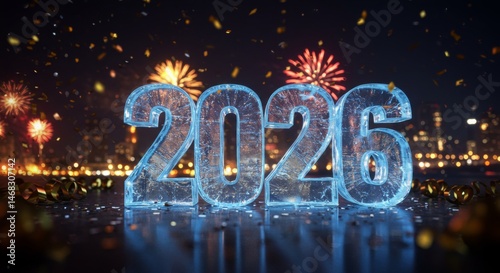 Ice sculpture numbers 2026 stand on a dark surface with confetti and fireworks in the background for new year's celebration, calendar year event.