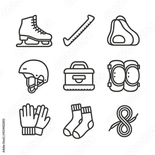 Ice Skating Essentials. Outline icon set of ice skating gear: ice skates, blade guard, skate bag, skate sharpening tool,