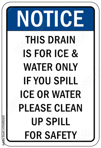 Ice warning sign and labels this drain is for ice & water only if you spill ice or water please clean for safety