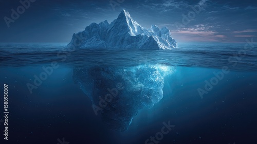 iceberg, underwater, night, sea, ocean, dark, ice, cold, mountain, floating, giant, hidden, visible, darkness, light, surface, depth, huge, nature, glacé, calm, silent, dramatic, contrast, mystery, spectacle, powerful, wonder, beauty, climate, change, risk, unseen, fragile, dangerous, environment, threat, preservation, conservation, future, crisis, ecological, impact, sustainability, protection, threatened, global