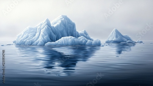 Icebergs Floating Calmly in Cold Waters Reflecting on a Tranquil Gloomy Day.