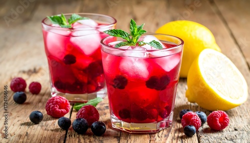 iced, berry, lemonade, drink, summer, refreshing, fruit, goggles, cold, sweet, glacé, delicious, healthy, table, wood, rustic, fresh, ingredient, lemon, raspberry, blueberry, mint, ice, colourful, drink, natural