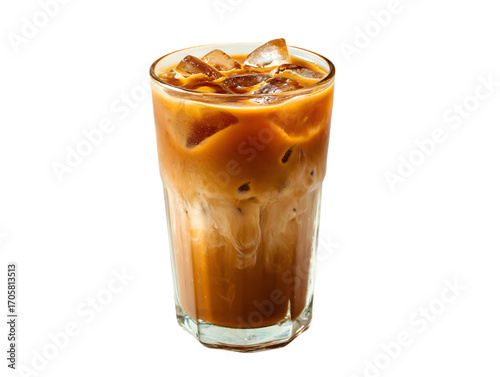 Iced Coffee: A refreshing glass of iced coffee, showcasing layers of rich espresso and cold milk swirling with ice cubes. A visually appealing refreshment to beat the heat, perfect for coffee lovers.