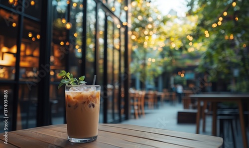 Iced coffee drink on wooden table in cozy outdoor cafe with warm lighting