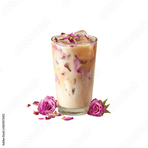 iced coffee, rose petal, pink rose, flower, ice, beverage, cafes, cafes, eatery, menu, food photography, delicious, tasty, sweet, floral, romantic, elegant, beautiful, high-quality, studio shot, closeup, isolated, iced tea, latte art, hot drink, tea