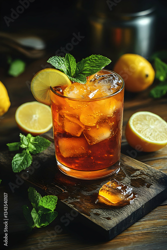 Iced tea with lemon and mint in a glass