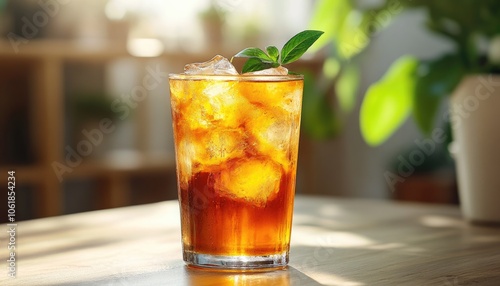 Iced Tea with Mint Garnish in Tall Glass on Wooden Table