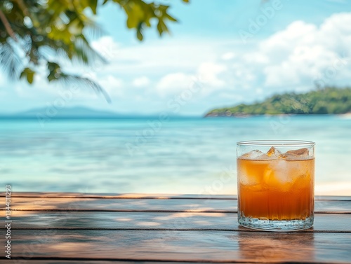 Iced Tropical Drink on Wooden Beach Table Summer Vacation