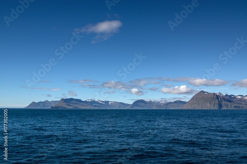 iceland, mount, stark, cold, mountain, hillside, green, water, shore, cloud, sea, ocean, atlantic, blue
