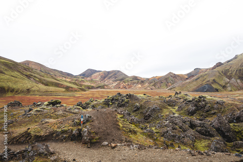 Iceland rainbow mountains in Landmannalaugar glow with surreal colors of volcanic rhyolite, moss, and ash painting nature own abstract masterpiece. Walking through rainbow