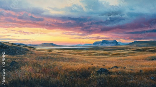 landscape, nature, sky, mountain, grass, sunset, cloud, field, horizon, gold, blue, pink, purple, orange, twilight, scenery, rural, outdoors, scenic, view, dramatic, peaceful, serene, beauty, huge, wild, open, meadow, hill, panorama, wide, bright, light, lake, water, calm, distance, background, foreground, natural