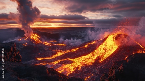 Icelandic Volcano Erupts at Sunset, Lava Flow