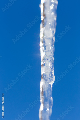 Icicle melts with falling drops on a background of bright blue sky