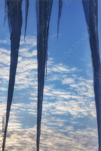 winter, cold, ice, icicle, blue, roof, sky, cool, thaw, frost, bright, clean, melt, clear, spring, weather, nature, sharp, shiny, season, outdoors, sunlight, eaves, transparent, closeup, white, snow, row, glistering, glittering, shine, hanging, april, background, space, dripped, sun, sunbeam, jan, sunshine, liquid, march, water, colder, wet, february, freeze, winterly, wintery
