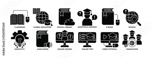 Icon Set of Education, E Learning, E Book, Global Education, Graduation, Q n A and more. Perfect for presentations, Website and app designs. Icon Glyph Style.