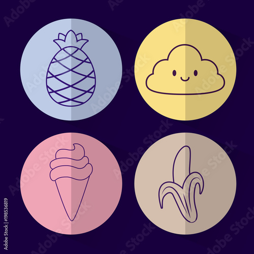 pineapple, cloud, ice cream, banana, cute, tender, adorable, beautiful, nice, pretty, beauty, charming, delightful, pleasant, precious, vector, illustration, line, sweet, love, lovely, hand-drawn, fancy, fantasy, colours, cartoon, design, character, graphic, drawing, hand, print, drawn, doodle, vignetting, icon, set, element, decoration, concept, trendy
