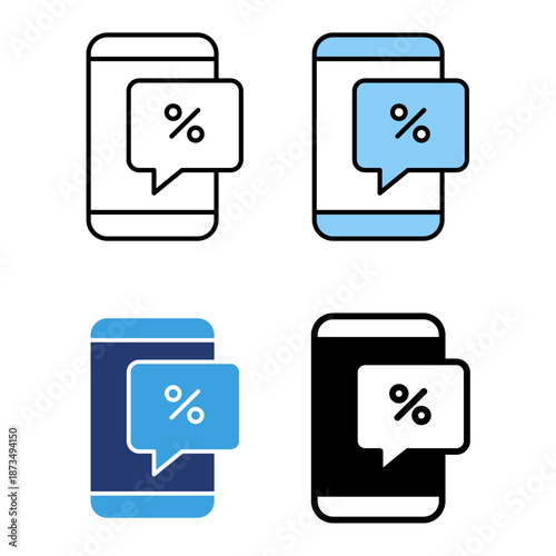 Icon set phone discount offer chat, shopping promo sale. Icon line, glyph and flat with blue colour isolated white background.