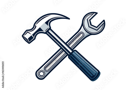hammer, wrench, tool, crossed, icon, repair, construction, metal, steel, silver, chrome, hand tool, mechanic, bricolage, building, workshop, hardware, equipment, instrument, tooling, craftsmanship, engineering, maintenance, fixing, assembly, labor, work, industry, craft, project, illustration, graphic, symbol, black background, isolated, clean, simple, vector
