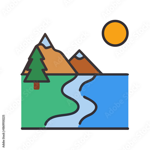 landscape, mountain, river, forest, tree, sun, nature, outdoors, sky, water, hill, peak, summer, icon, graphic, illustration, design, flat, vector, cartoon, scenery, horizon, vista, panorama, hillside, wood, sunrise, daytime, sunny, weather, climate, environment, ecology, travel, vacation, tour tourism, recreation, explore, adventure