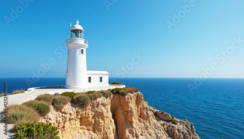 Iconic white lighthouse on Formentera clifftop, azure sea backdrop, summer, light
