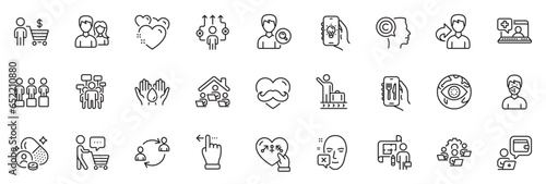 Icons pack as Equity, Genders and Voting campaign line icons for app include Search people, Couple, Cyber attack outline thin icon web set. Heart, Father day, User communication pictogram. Vector