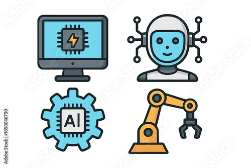 icon, set, technology, ai, artificial, intelligence, automation, robot, robotic, industry, future, tech, vector, illustration, modern, machine, learning, computer, processor, chips, arm, manufacturing, industrial, futuristic, innovation, cyborg, android, bionic, mechanical, hardware, software, smart, datum, processing, development, production, factory, symbol, graphic, design, element, pictogram, flat, cartoon, power, gear