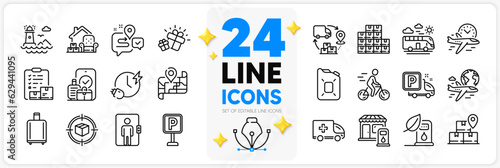 parcel, tracking, truck, parking, charging, icon, time, elevator, delivery, service, carry-on, baggage, bicyclist, bus, travel, gasoline, station, reclaim, filling, canister, oil, wholesale, inventory, lighthouse, flight, gift, international, ambulance, emergency, map, journey, packing, thing, checklist, supply, chain, car, global, chair, fuel, earth, charger, transportation, vector, line, three-dimensional, star, outline, pen, tool