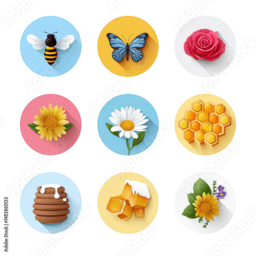 bee, honey, flower, rose, daisy, sunflower, butterfly, honeycomb, pollen, nature, stack, dessert, sweet, food, nectar, hexagon, plant, blossom, wing, 9, circular, icon, with, cream, chunk, leaf, each, different, colours, palette, isolated