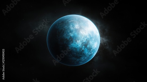 Icy blue exoplanet in dark space; cosmic background, science fiction use