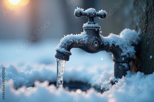 Icy faucet covered in delicate ice crystals, frosty morning scene, cold, frozen