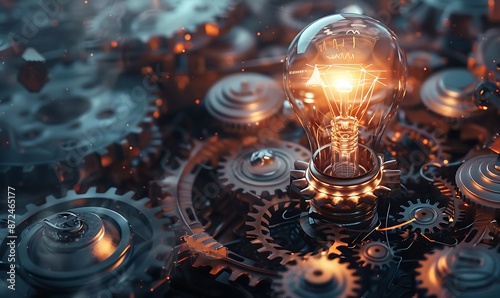 Idea Lightbulb A glowing lightbulb surrounded by interconnected gears and circuits