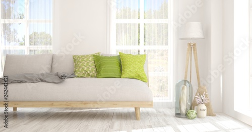 Idea of white minimalist room with sofa. Scandinavian interior design. 3D illustration
