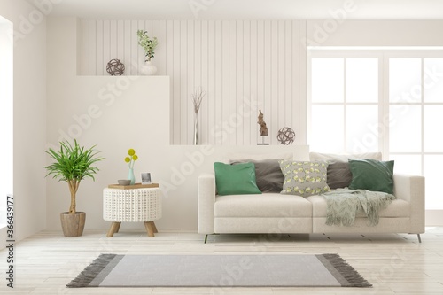 Idea of white minimalist room with sofa. Scandinavian interior design. 3D illustration