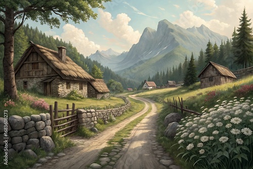 mountain landscape, countryside, rural scene, stone wall, winding road, vale, forest, pine tree, wildflower, meadow, summer, nature, scenic view, pastoral, idylli, quaint, charming, old architecture, bungalow, farmhouse, pasture, hiking trail, scenic route, mountain scenery