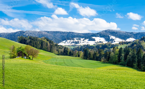 Idyllic spring mountain rural landscape in Hirzel, Switzerland