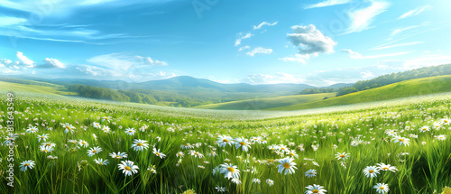 Idyllic summer landscape with lush green hills and daisy fields under a clear blue sky. Generative AI